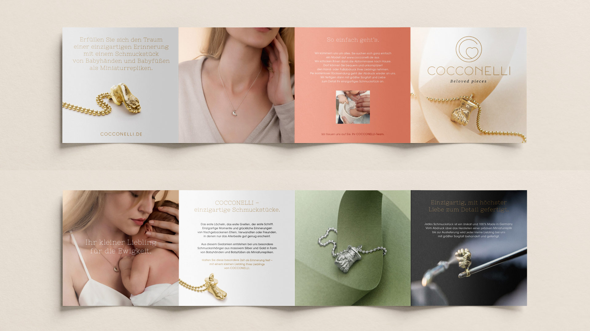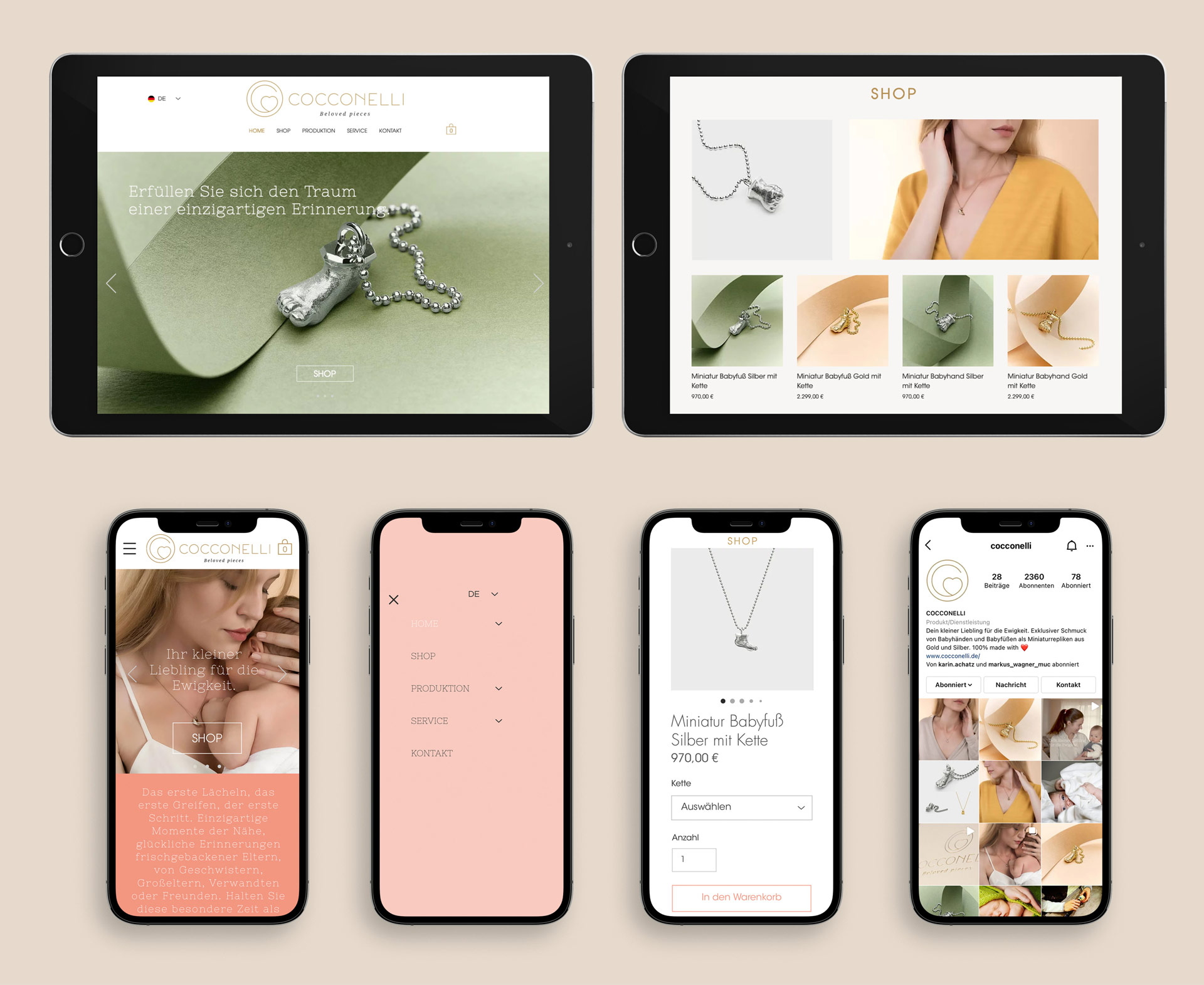 COCCONELLI fertigt und vertreibt edle und besondere Schmuckanhänger aus massivem Silber und Gold in Form von Babyhänden und Babyfüßen als Miniaturrepliken. Die luxuriösen Schmuckstücke werden ausschließlich online verkauft. Mittels einer Abdruckmasse, die an den Kunden versendet wird, werden die Fuß- oder Handabdrücke genommen. Von der Markenstratgie, Naming, Corporate Design bis hin zum Webshop und Social Media.