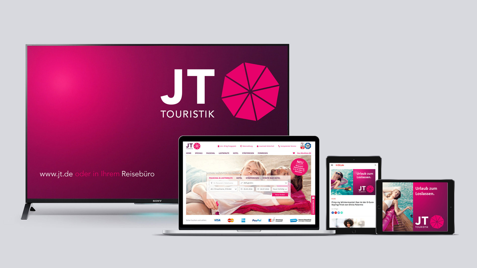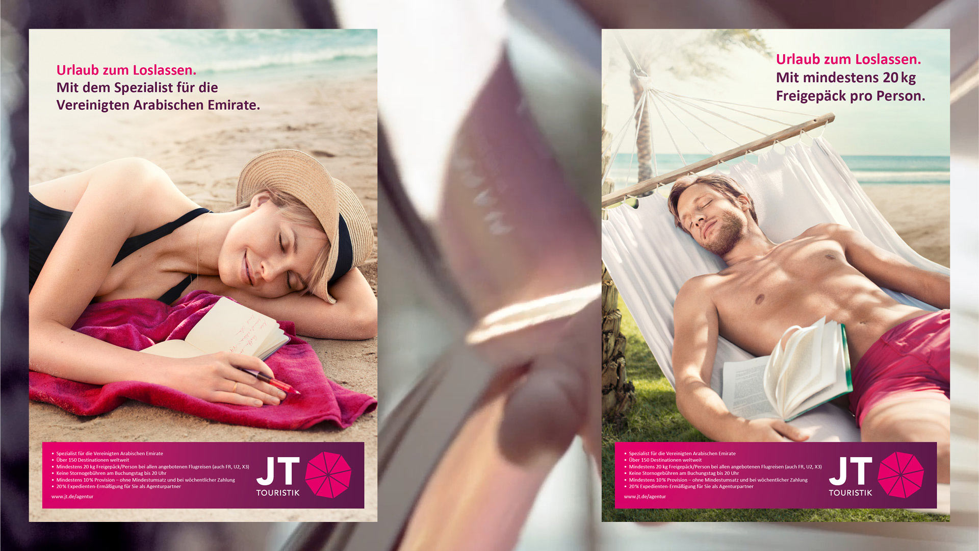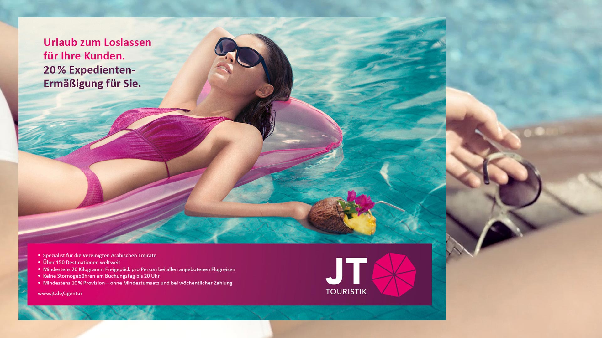 JT Touristik ist der Anbieter hochwertiger Reisen. Umwerfende Destinationen, mega Entspannung: „Urlaub zum Loslassen“. Begleitend zur TV-Kampage entstanden Anzeigen, Banner, POS-Maßnahmen und Mailings.