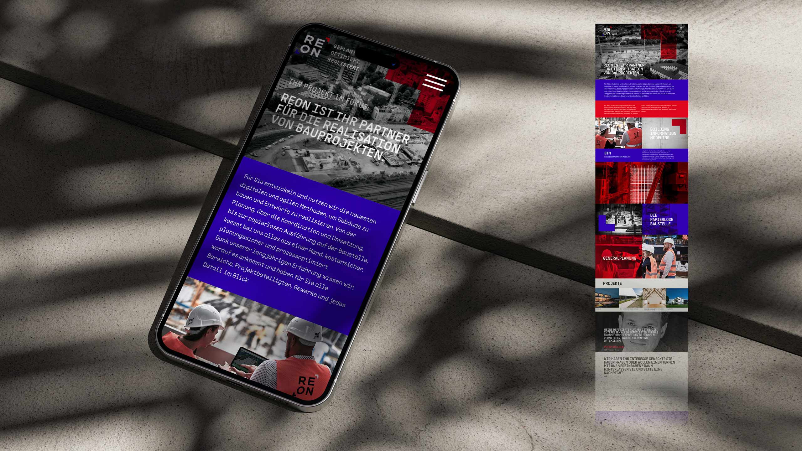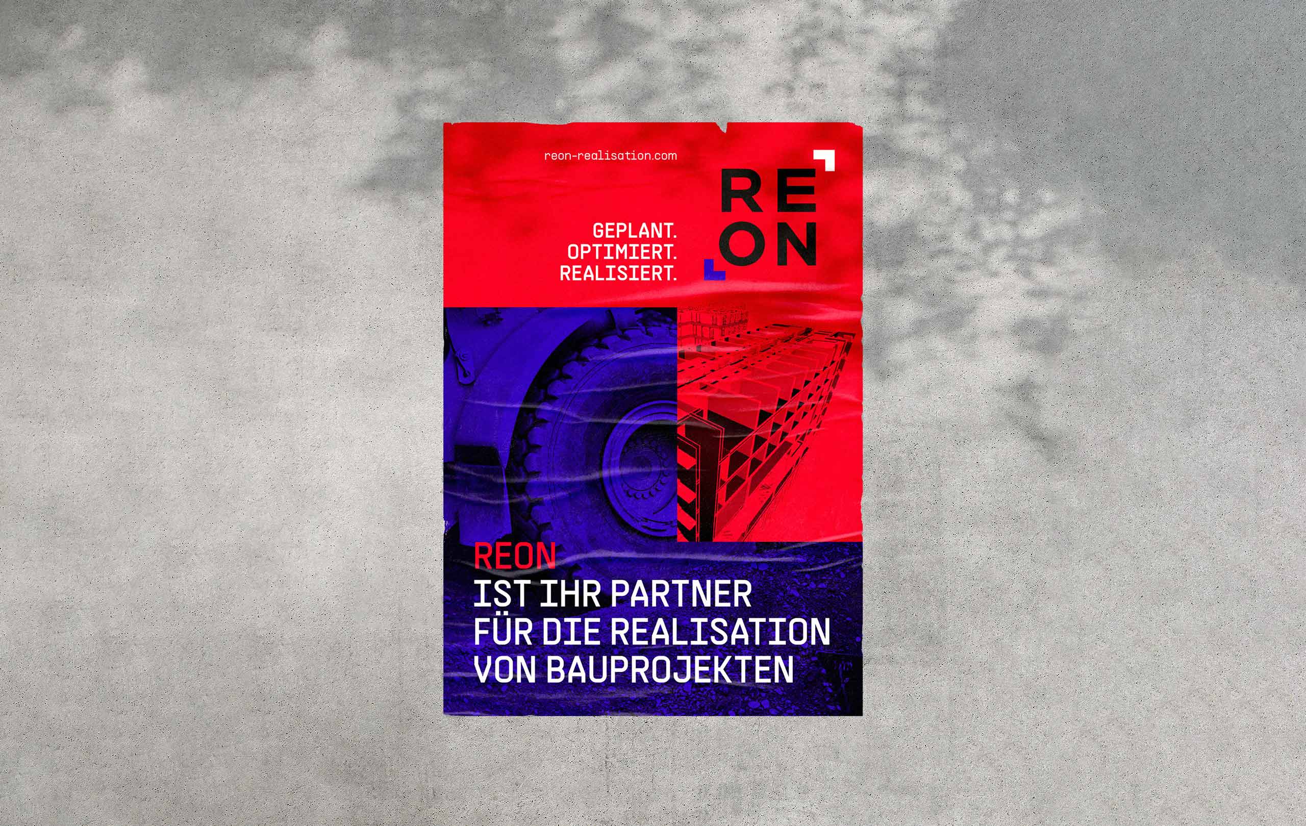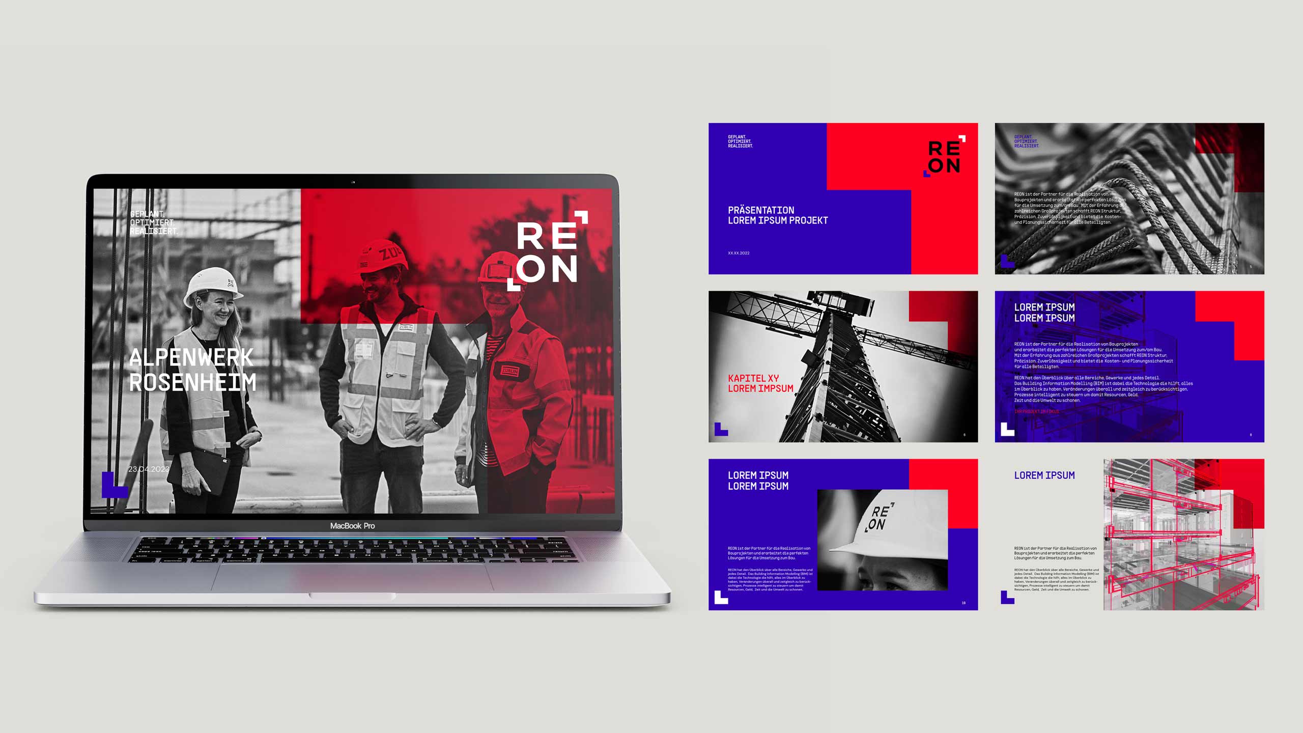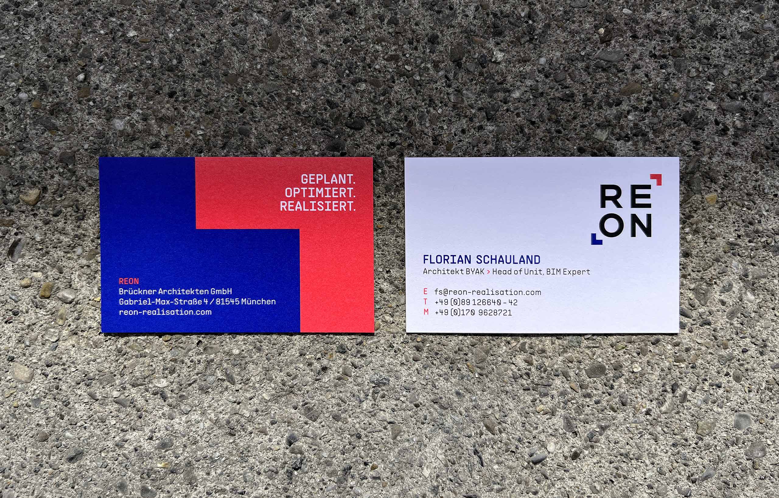 REON ist der Partner für die Realisation von Bauprojekten. REON nutz die neuesten digitalen und agilsten Methoden, um Gebäude zu bauen und zu realisieren. Dabei hat REON alle Projektbeteiligten, Gewerke, Timings und jedes Detail im Blick – Projekt im Fokus. Modern, technisch, laut und state of the art präsentiert sich das Erscheinungsbild von REON – mit dem „Fokus“ als prägendes Designelement in den Signalfarben Rot und Blau.